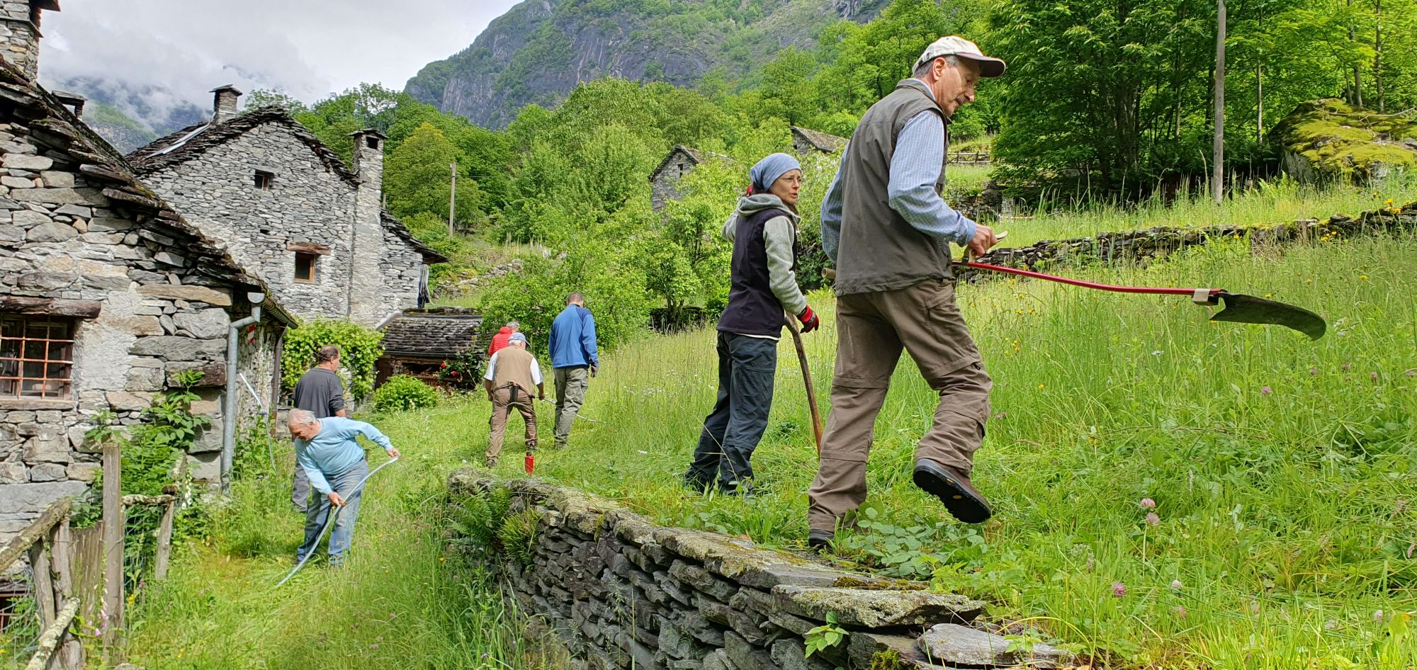 Impariamo a usare la falce fienaia, a segà a ranza, con Ermanno Blättler e Tiziano Maddalena.